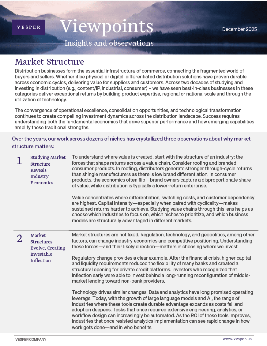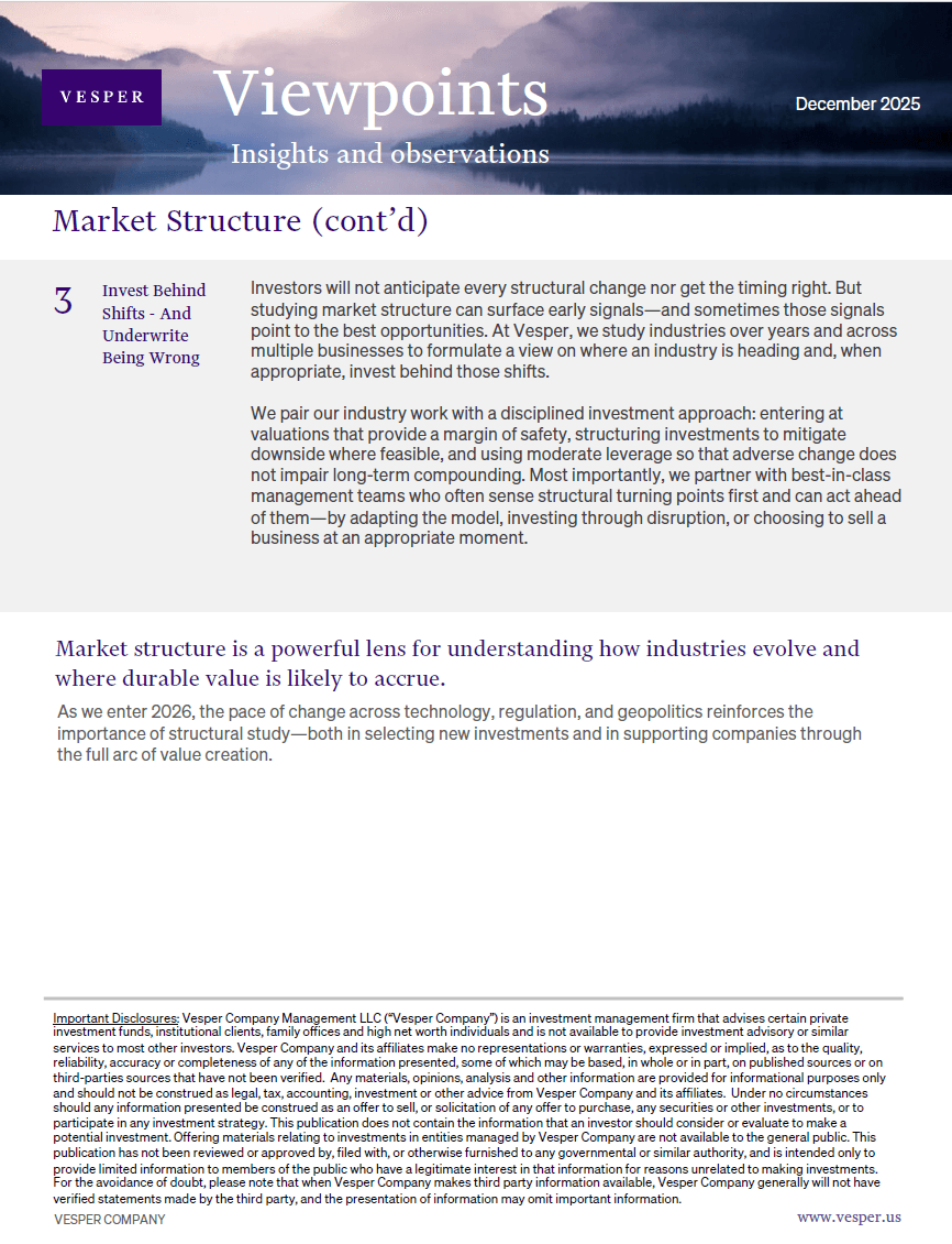 Vesper Company Management LLC (“Vesper Company”) is an investment management firm that advises certain private investment funds, institutional clients, family offices and high net worth individuals and is not available to provide investment advisory or similar services to most other investors. Vesper Company and its affiliates make no representations or warranties, expressed or implied, as to the quality, reliability, accuracy or completeness of any of the information presented, some of which may be based, in whole or in part, on published sources or on third-parties sources that have not been verified. Any materials, opinions, analysis and other information are provided for informational purposes only and should not be construed as legal, tax, accounting, investment or other advice from Vesper Company and its affiliates. Under no circumstances should any information presented be construed as an offer to sell, or solicitation of any offer to purchase, any securities or other investments, or to participate in any investment strategy. This publication does not contain the information that an investor should consider or evaluate to make a potential investment. Offering materials relating to investments in entities managed by Vesper Company are not available to the general public.